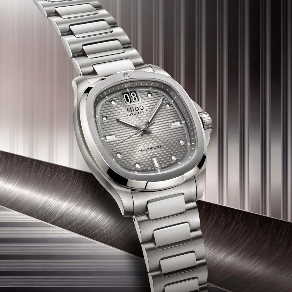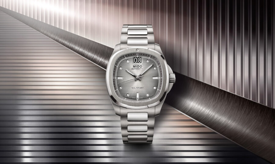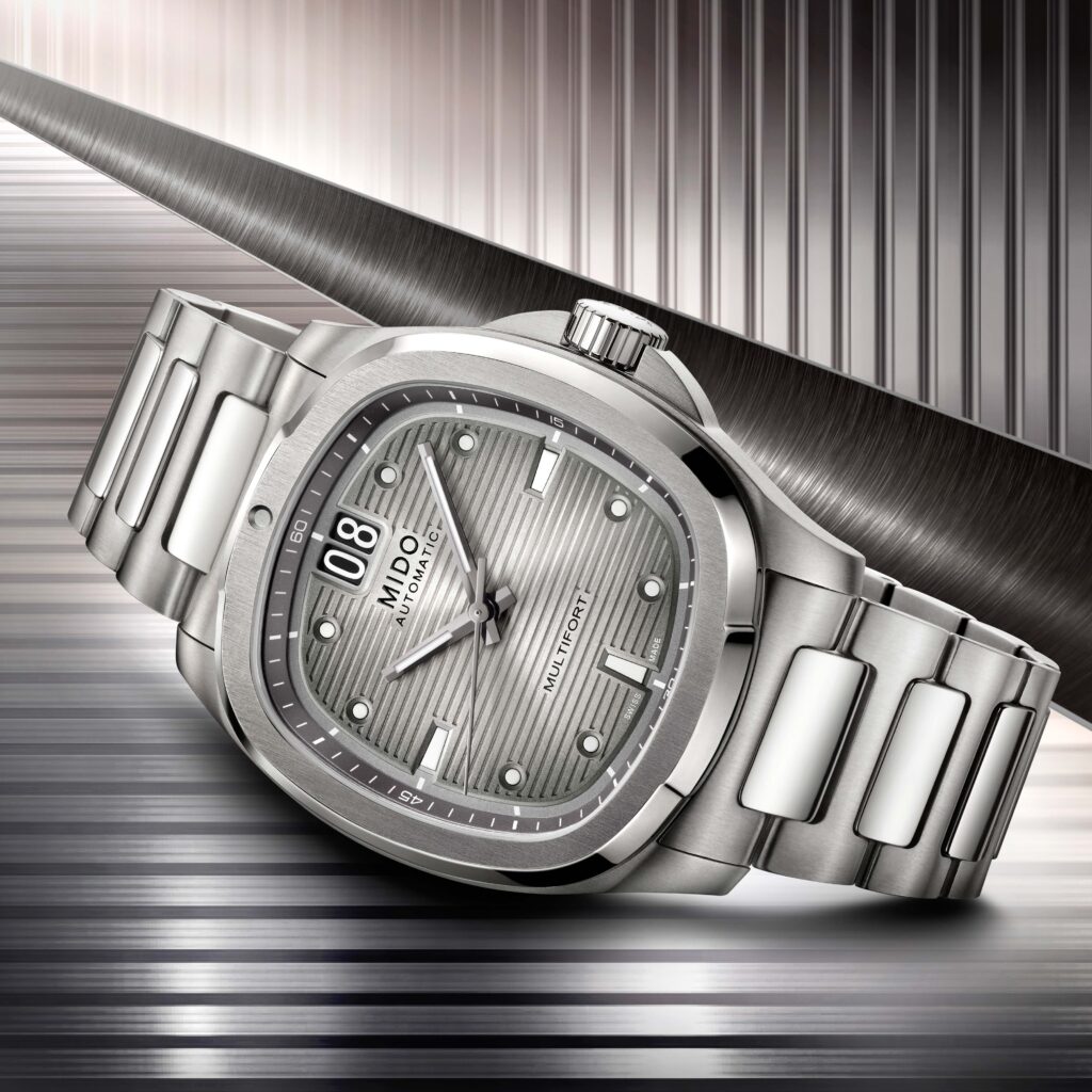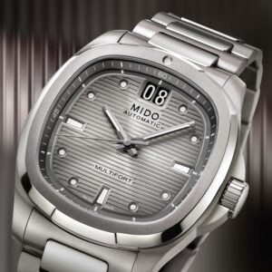 สำหรับเรือนเวลาดีไซน์ใหม่ล่าสุดจาก มิโด (MIDO) ในคอลเลกชั่น มัลติฟอร์ท ทีวี บิ๊ก เดท ไทเทเนียม (Multifort TV Big Date Titanium) นำเสนอรูปลักษณ์ที่โดดเด่นในทุกมิติ ผ่านวัสดุไฮเทคระดับพรีเมียมอย่างไทเทเนียม (Titanium) มาพร้อมหน้าปัดทีวีสุดคลาสสิกที่กลับมาโลดแล่นอีกครั้งเพื่อตอกย้ำความสำเร็จของ มัลติฟอร์ท ทีวี บิ๊ก เดท (Multifort TV Big Date) โดยคอลเลกชั่นนี้มาพร้อมตัวเรือนไทเทเนียมขัดซาตินที่เพิ่มความหรูด้วยการขัดเงาที่ข้อต่อตรงกลาง ตัวสายถูกออกแบบให้เชื่อมต่ออย่างกลมกลืนกับตัวเรือน ด้วยหน้าปัดขนาด 40 มิลลิเมตร โดดเด่นด้วยการไล่เฉดสีเทาเงินในโทนโมโนโครม และตกแต่งด้วยเทคนิคซันเรย์ขัดซาตินพร้อมลายเส้นแนวนอนที่ละเอียดประณีต โดยมีช่องแสดงวันที่ขนาดใหญ่ (Big Date) ที่ตำแหน่ง 12 นาฬิกา ใช้ตัวเลขสีขาวบนพื้นดำเพื่อให้อ่านค่าได้อย่างชัดเจน และกรอบเบเซิลตกแต่งด้วยการพ่นทรายเพื่อเพิ่มมิติ